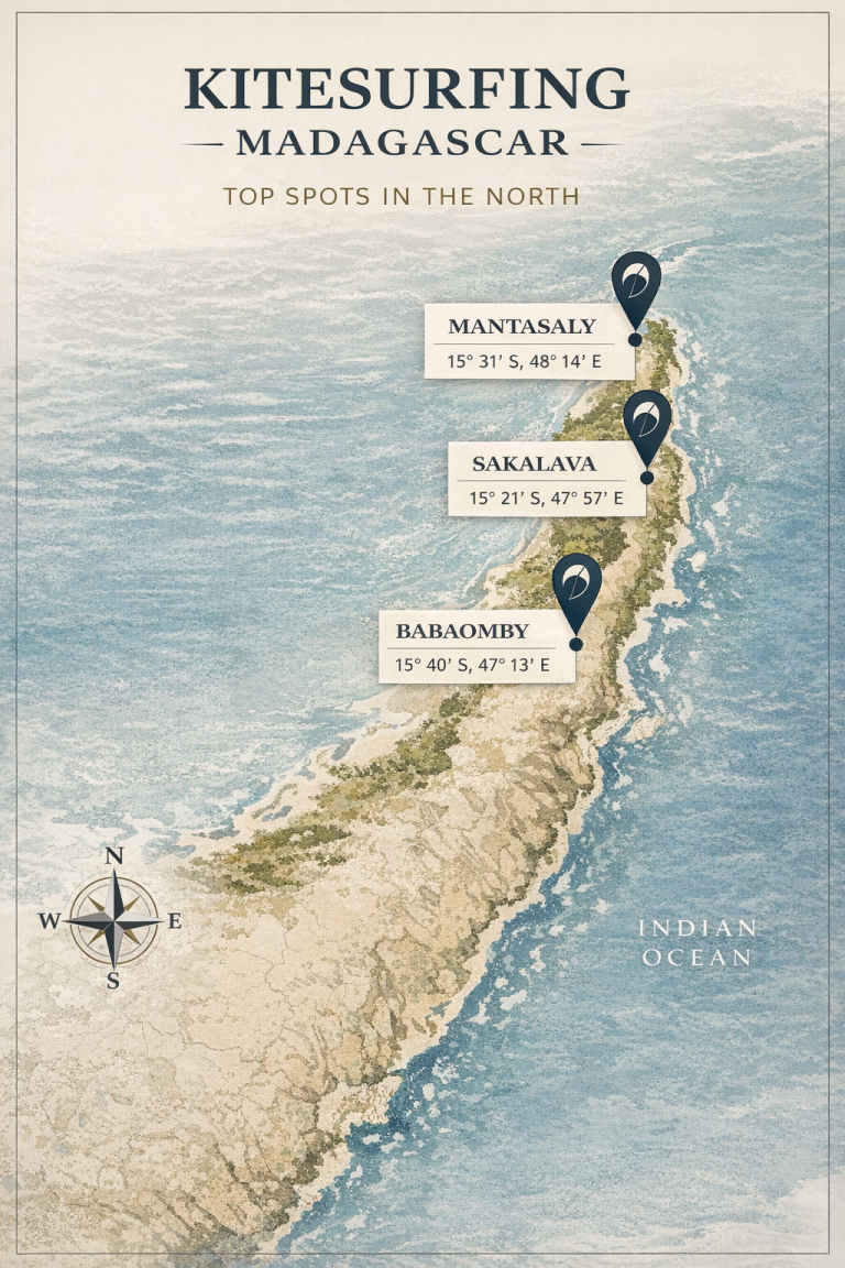 Madagaskar to jedno z najpewniejszych wiatrowo miejsc na świecie. Przez większą część roku północ wyspy pozostaje pod wpływem stabilnych pasatów, które każdego dnia wypełniają laguny równym, mocnym wiatrem. Dla kitesurferów oznacza to jedno — sesje od rana do zachodu słońca.