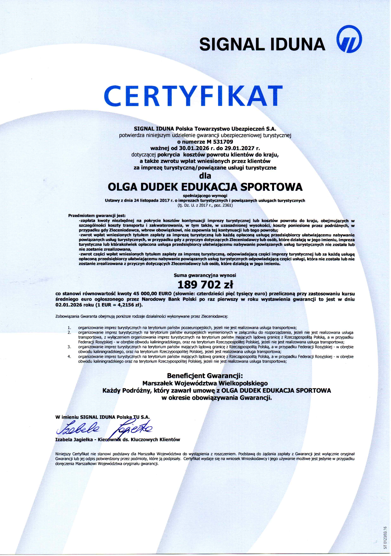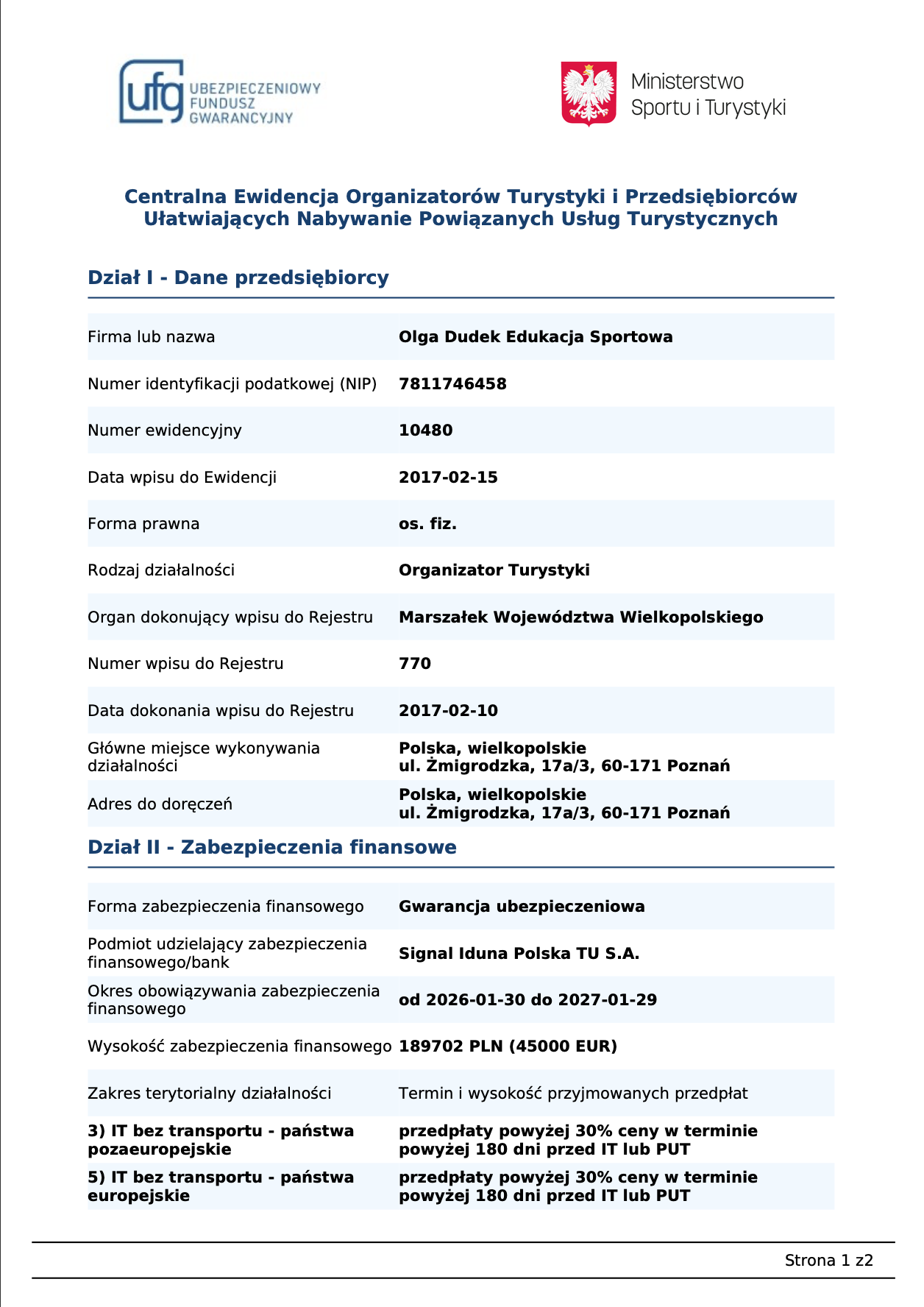 Organizator obozów „Olga Dudek Edukacja Sportowa” wpisany jest do Rejestru Organizatorów i Pośredników Turystycznych Marszałka Województwa Wielkopolskiego pod nr 770. Posiadamy wszystkie niezbędne zgody i pozwolenia na organizacje wypoczynku dzieci i młodzieży, a każdy turnus zgłaszany jest do Kuratorium Oświaty.